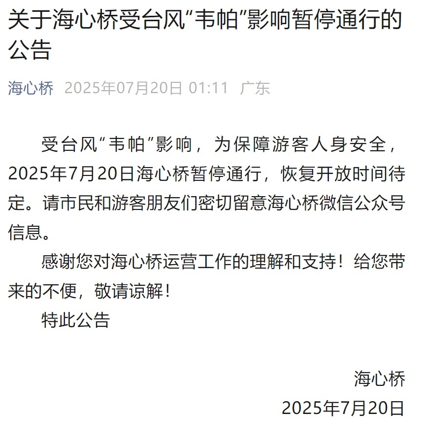今日(20日)凌晨,广州塔、海心桥分别发布公告称炒股配资门户网官网,受台风“韦帕”影响,为保障游客人身安全,7月20日广州塔暂停对外营业、海心桥暂停通行,恢复开放时间待定。